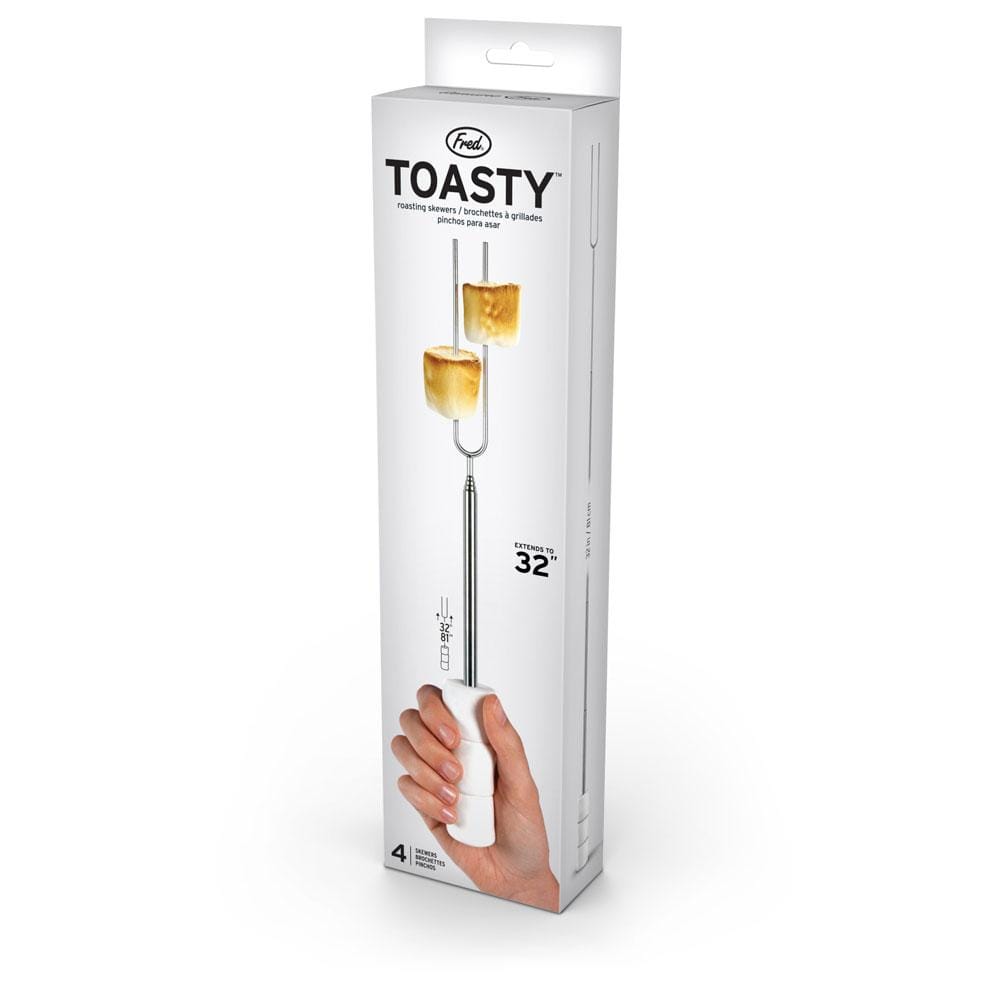 Fred & Friends: Toasty Roasting SkewersThere is nothing more fun than roasting marshmallows in the great outdoors. Fred's TOASTY skewers offer a modern upgrade to your garden-variety twigs and branches. Sturdy, soft-touch "marshmallow" handles provide a stable grip while you roast. Quality stainless-steel skewers store at a compact 12 inch (30.5 cm) and telescope all the way to a safe 32 inch (81 cm) long! Set of four.