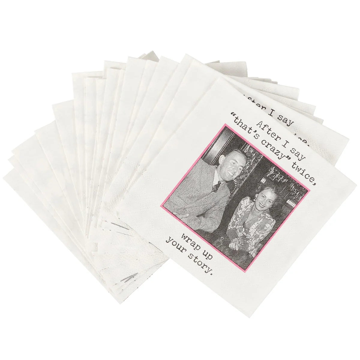 Perfect for entertaining guests and making clean-up a breeze, this disposable beverage napkin from our Trash Talk By Annie Collection displays a vintage black and white photograph complemented with a humorous sentiment that reads "After I Say 'That's Crazy' Twice, Wrap Up Your Story." Beverage napkin also features a coordinating retro pattern on the back when flipped as well as the rest of the napkin when unfolded. Our That's Crazy Twice beverage napkin measures 5" by 5" and comes shrink-wrapped in a set of 20 napkins. A fun retro bar accessory perfect for everyday use.