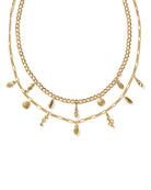 Seahorses, sand dollars, and seashells–oh, my! The Alexa Vintage Gold White CZ Multi Strand Necklace features all your favorite beach finds, so you don’t have to leave any behind. With both Figaro and curb chains, this charming piece makes for an effortlessly lovely layered look.