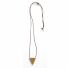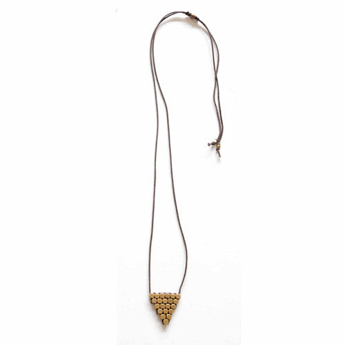 This pyramid  shaped woven pendant is fun and bold.  The unique way this piece is created elevates the ever popular triangle shape.  It has an adjustable closure so it can be worn at any length, chocker to 36 inches.  With its neutral colors and adjustable size it is a unique and perfect accent to any day. It is made with brass beads, waxed polyester, and cotton thread.