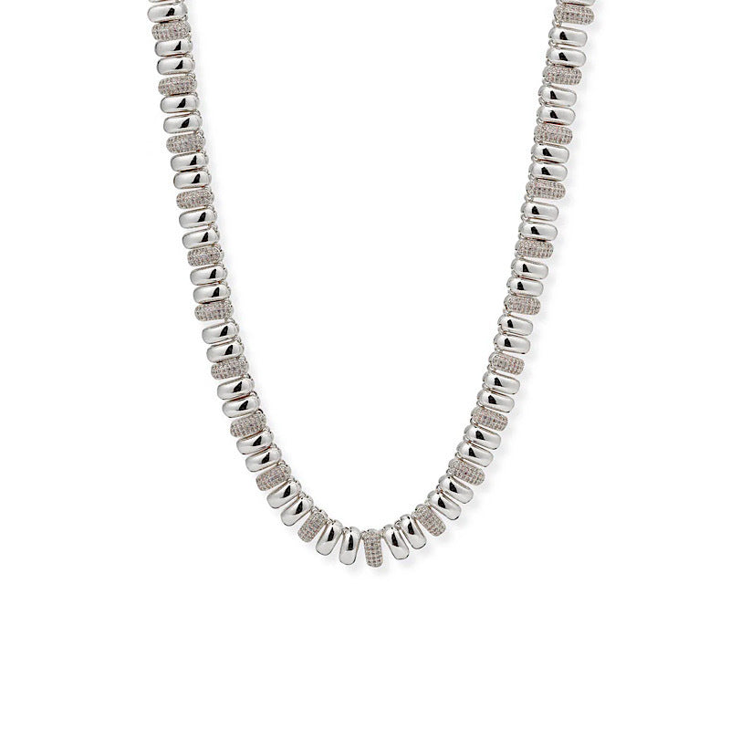 Introducing the Portia Necklace—a stunning twist design accented with shimmering diamonds. Elevate any outfit with this statement piece, which lays flat and can be easily layered for ultimate versatility. Experience the luxurious beauty and sparkle of this must-have accessory.