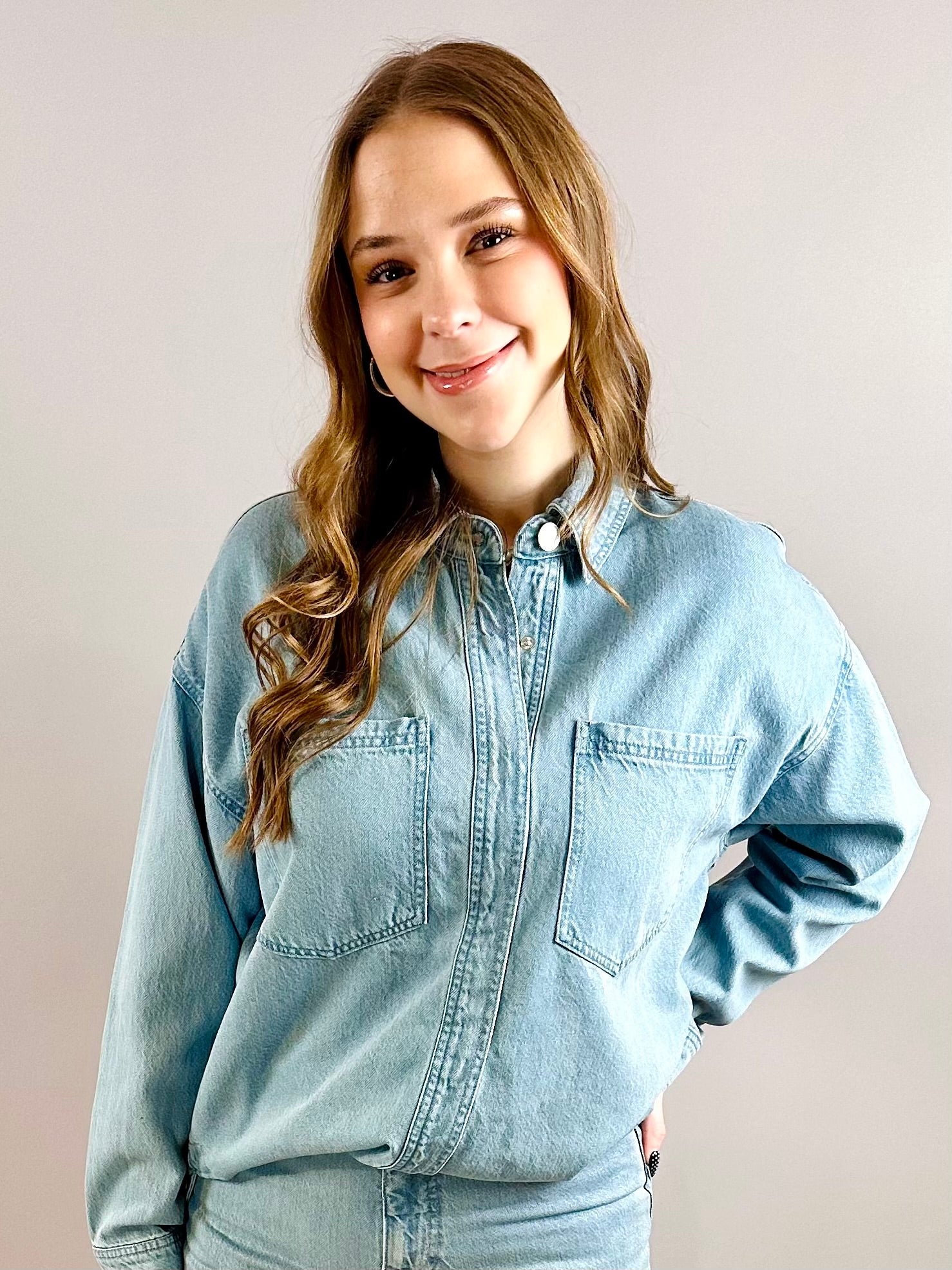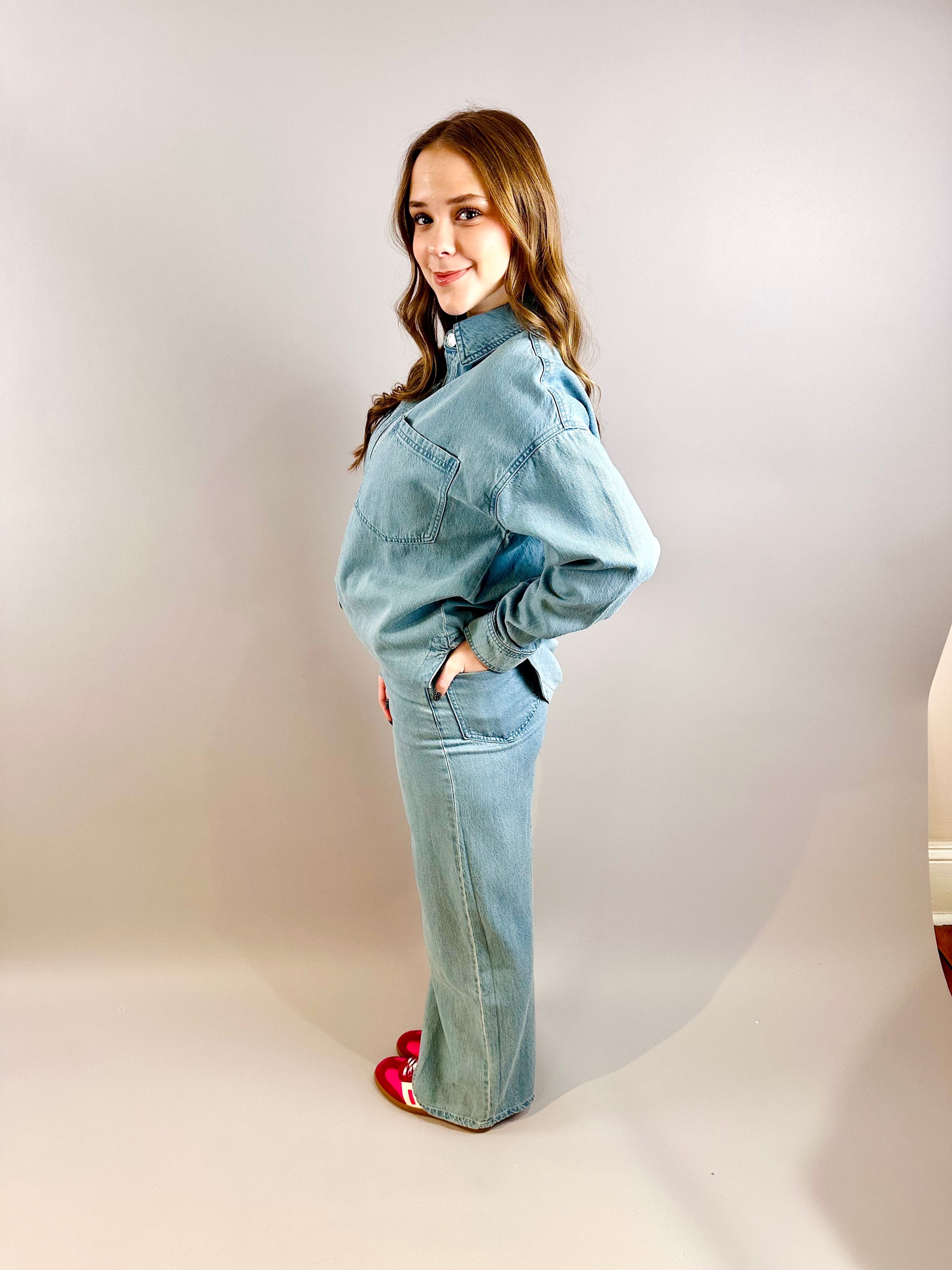 This relaxed denim twill jacket blends vintage-inspired charm with modern ease, featuring a collared neckline, patch pockets, and a snap-up front. A lightweight staple, it’s the perfect layer for any season.