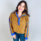 Cozy fleece pullover featuring a half-zip closure and high neckline with bold contrast seams throughout and an adjustable hemline.
