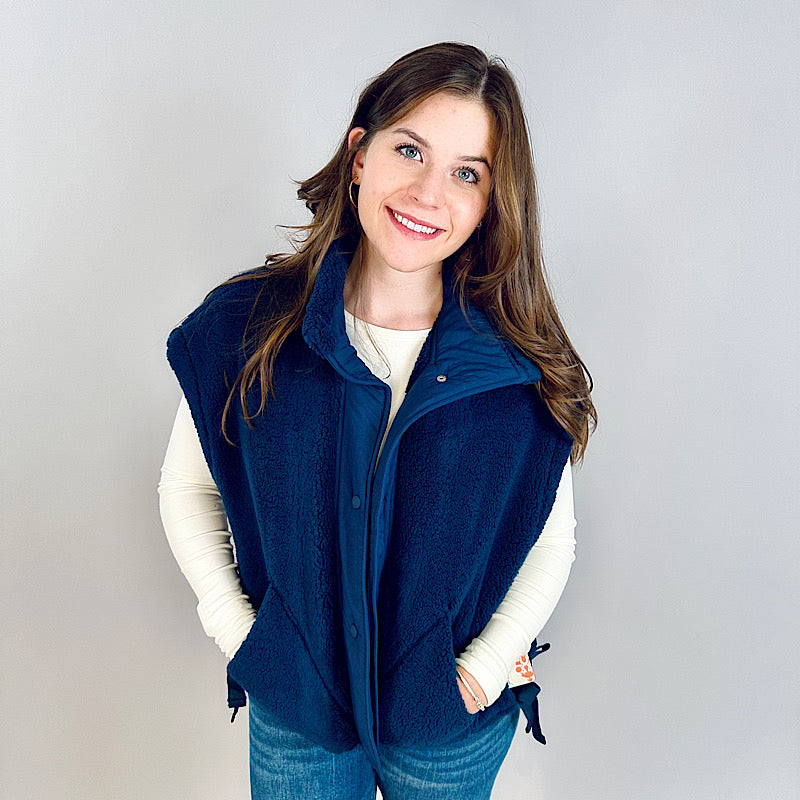 So necessary for your next camping trip, this cozy fleece vest is featured in an oversized fit and classic sleeveless design with a button-front closure and cozy hand pockets.
