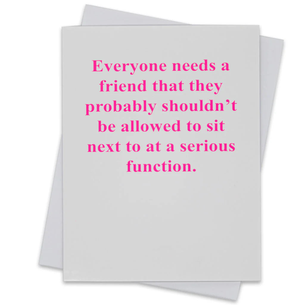 Everyone needs a friend that they probably shouldn't be allowed to sit next to at a serious function. Inside: Blank 4 1/4" x 5 1/2" greeting card loaded with wit and humor that both men and women will enjoy! Perfect for multiple occasions Each card and envelope comes in a clear sleeve for protection.