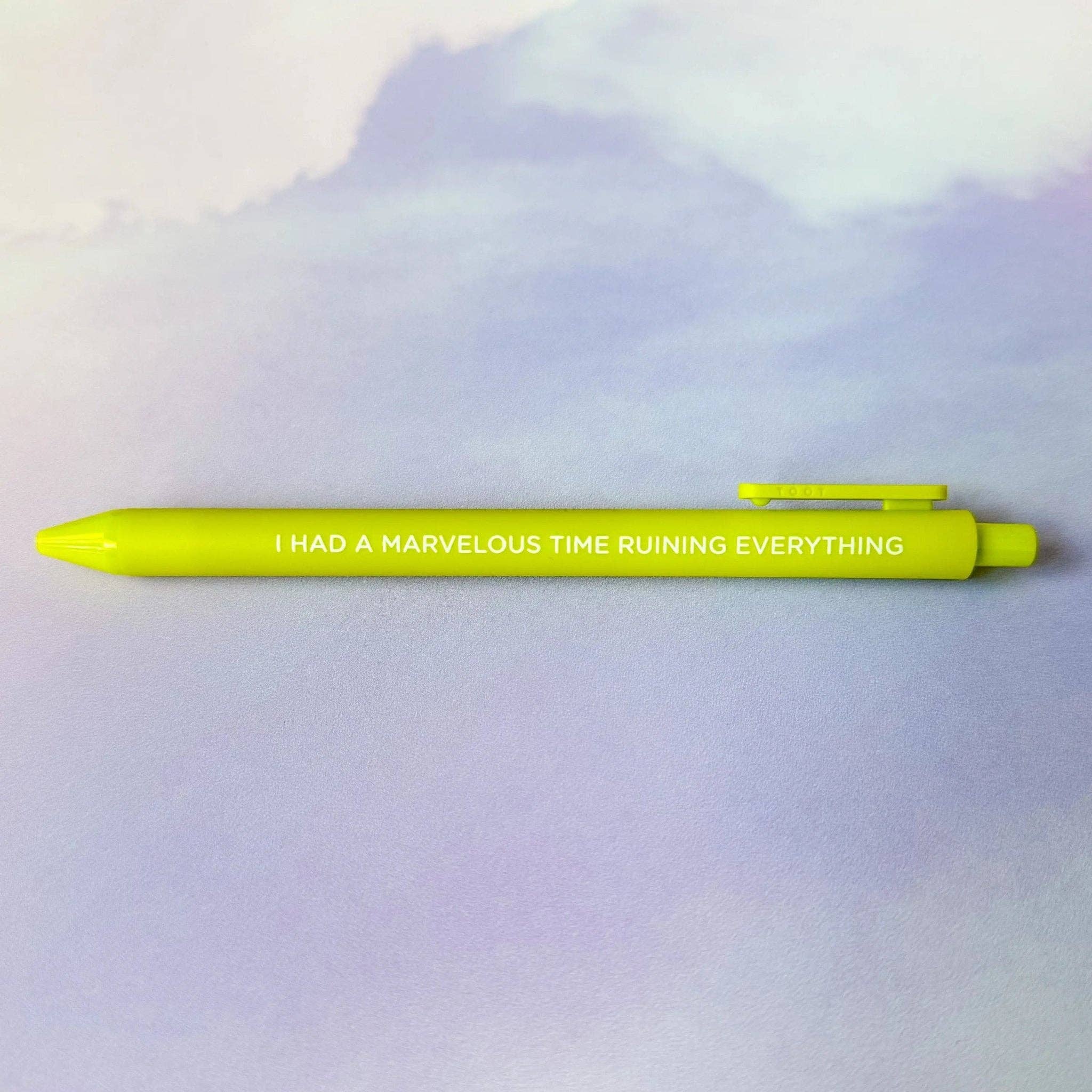 Write down all of your folklore and evermores with the I Had a Marvelous Time Ruining Everything pen from the Folkmore Pen Set! This jotter gel pen is inspired by Tay's The Last Great American Dynasty from the Folklore album. The lyric is embossed on a citron pen barrel with black gel ink. I Had a Marvelous Time Ruining Everything - citron barrel with black ink 0.5mm fine point Gel ink **Please note, color of actual pen may vary slightly due to the settings of the device you are viewing the listing on.