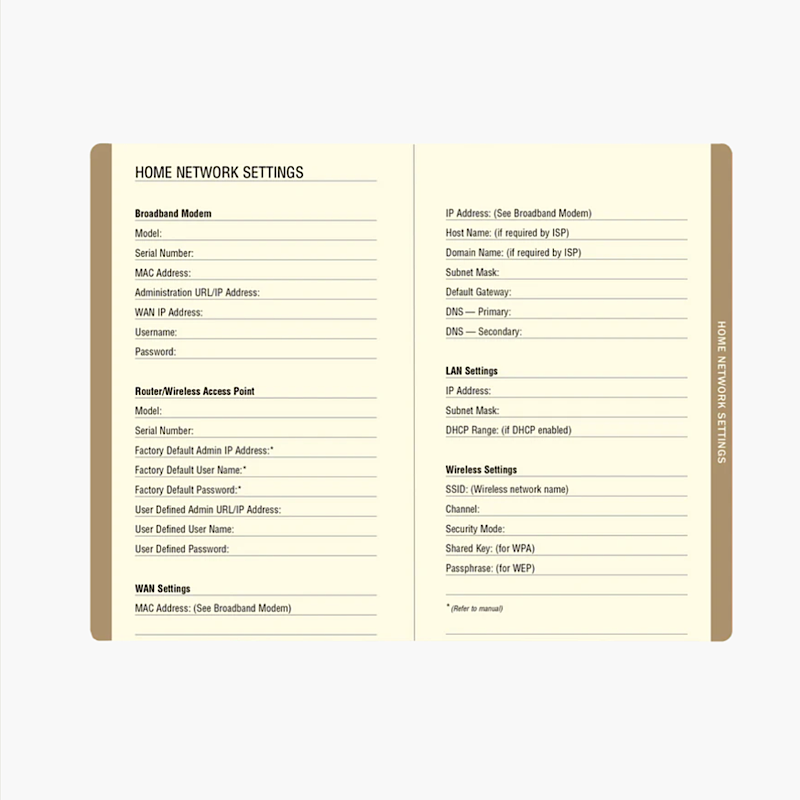 - You can also make notes about home network configurations, software license numbers, etc., in pages in the back of the book.