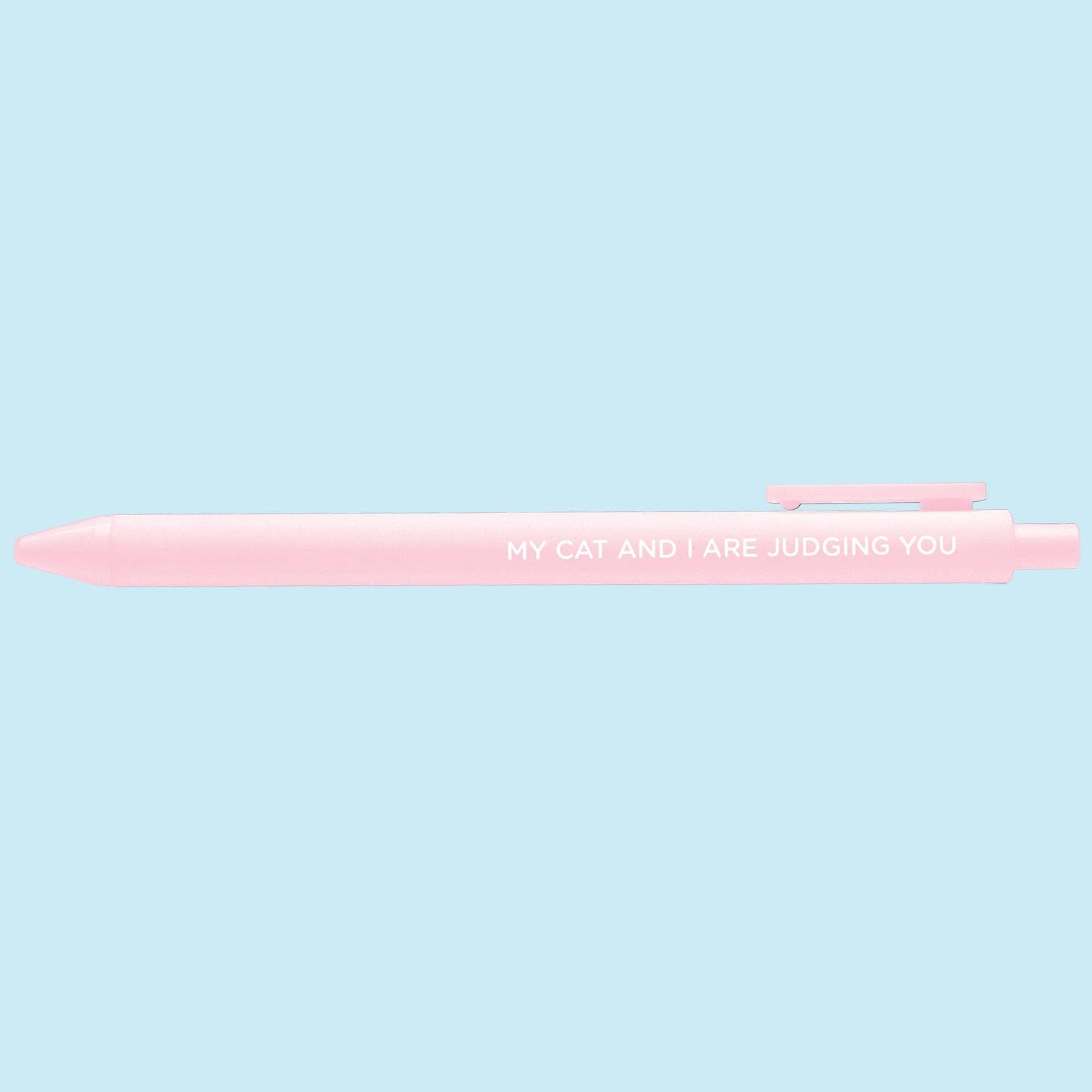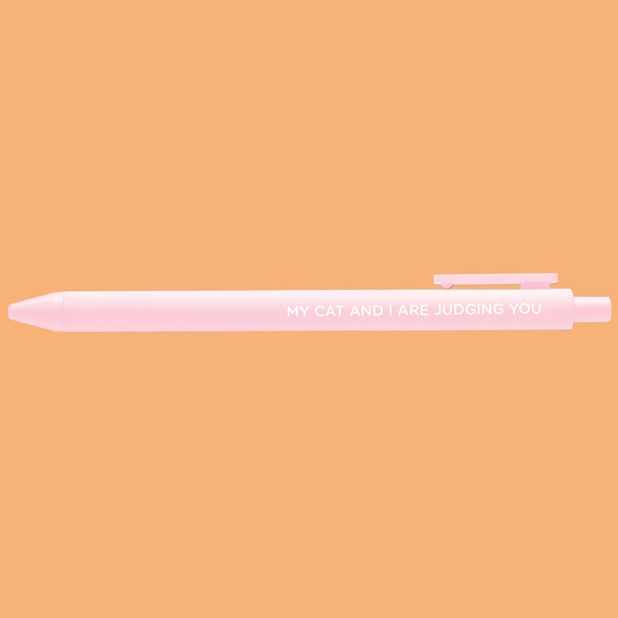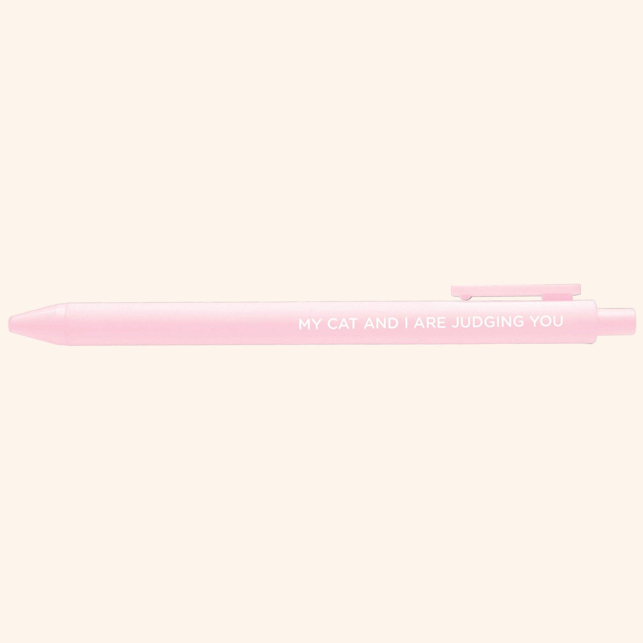 Our "MY CAT AND I ARE JUDGING YOU" pen is perfect for cat people with opinionated cats. With bold white text on a blush pink pen, it’s the perfect desk accessory for writing lists, notes, or love letters to your cat.