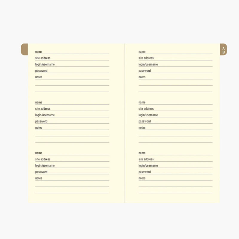 - This time- and headache-saving little volume is organized with tabbed A to Z pages, with space on each page to write down websites, usernames, passwords, and extra notes.