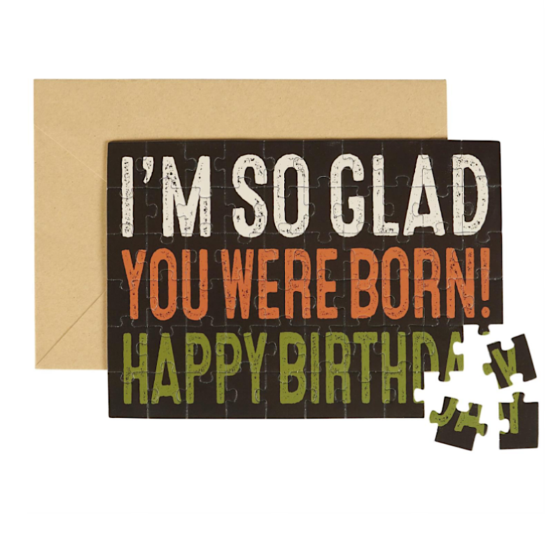 Don't just give your feelings away, make 'em work for it. This relatable greeting card puzzle combines the feels of a greeting card with the personal pride of completing a puzzle. Questionables puzzle cards include a blank space on the back to write a personal message or express creativity in any way they want before breaking up the puzzle for someone special to piece together the fun inside! We get them started with a straight-forward sentiment on the front that reads "I'm So Glad You Were Born - Happy Birthday." They do their thing on the back, punch out the pieces, and place them in the included craft envelope. Everything is packaged in a polybag with an insert displaying easy instructions. Due to the shape and weight, extra postage is required when mailing puzzle cards. Our Cannot Stress puzzle card offers a fun down-to-earth way to wish family or friends a happy birthday.