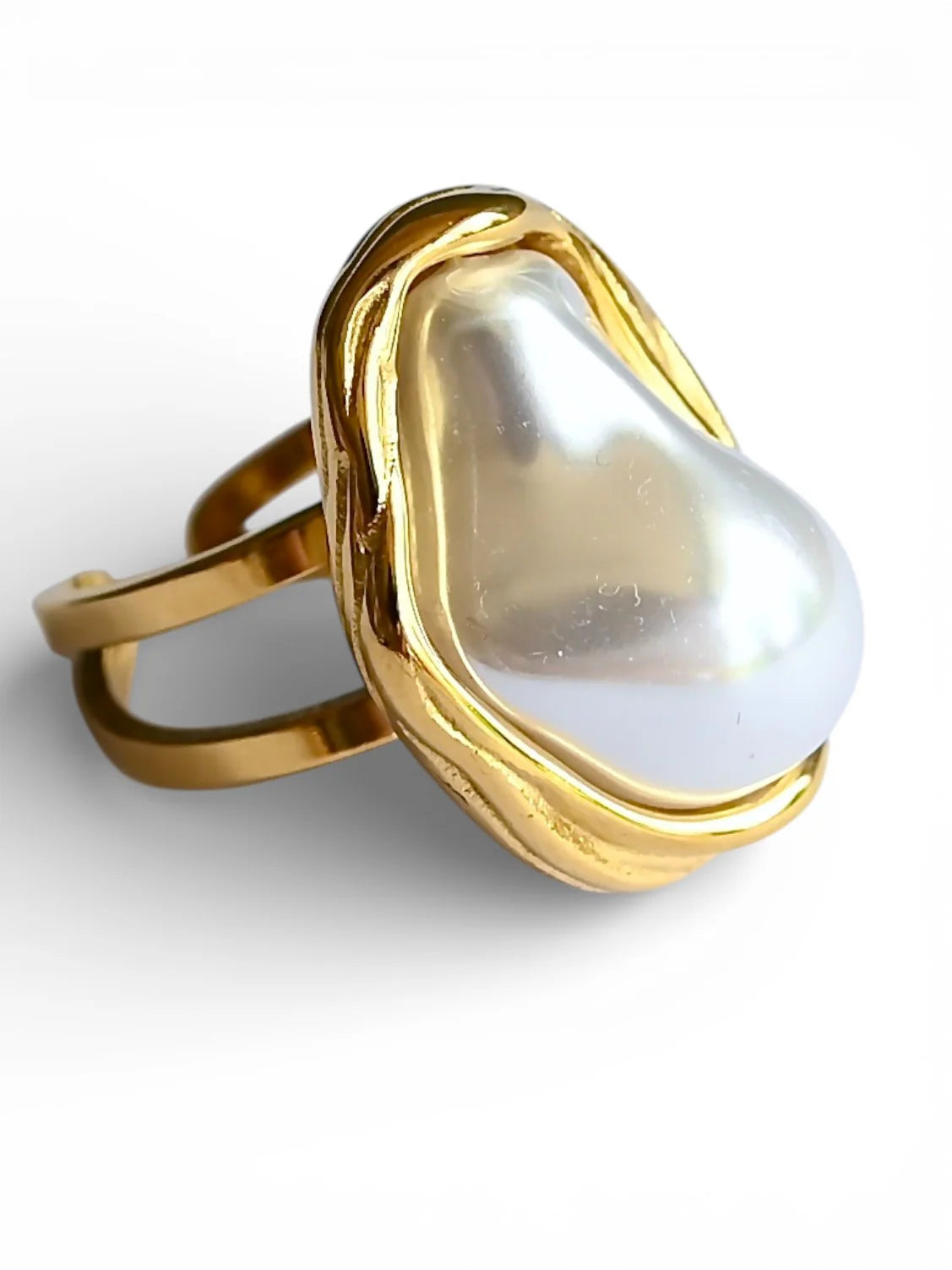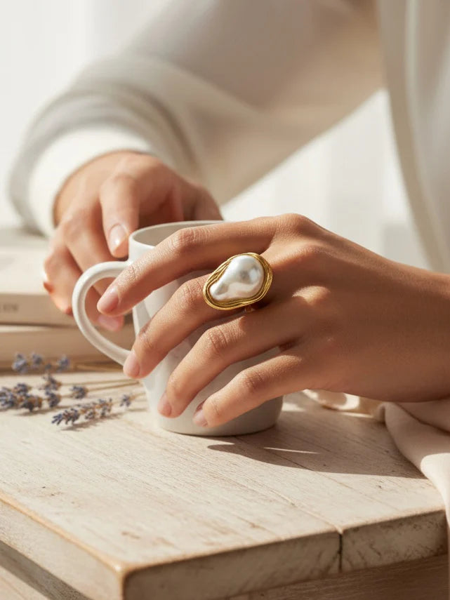 An adjustable statement ring featuring a luminous pearl set in a smooth gold rim. Bold yet timeless, this piece brings a coastal-inspired elegance to any look.