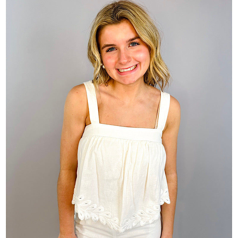 You'll love this dreamy linen tank with the prettiest details. Delicate cutwork embroidery, adjustable button straps, and a built-in jersey bra make this square-neck top as comfortable as it is pretty.