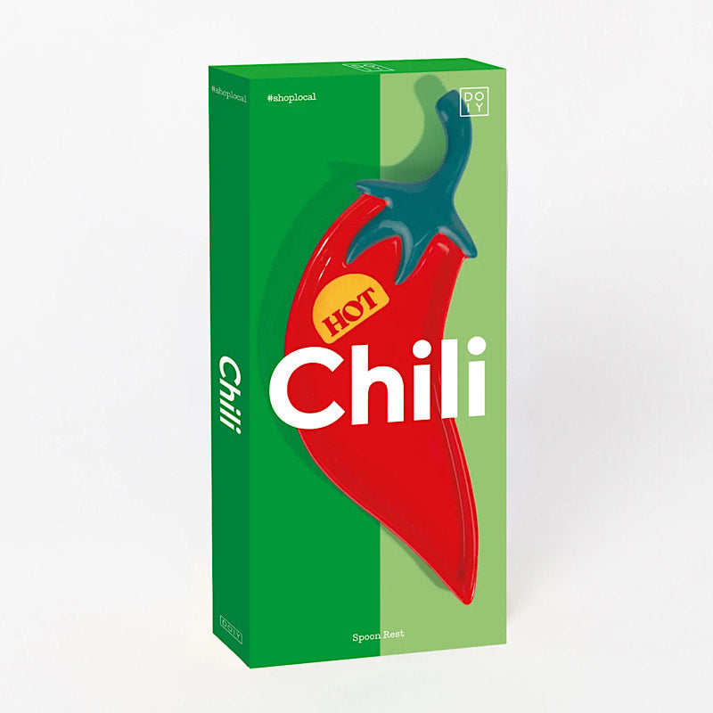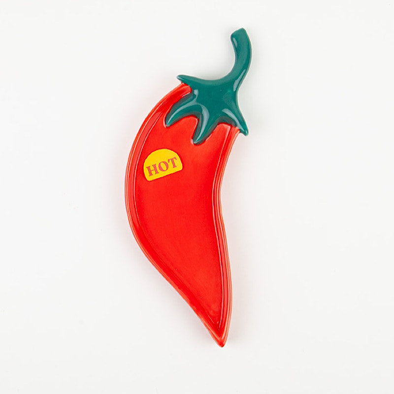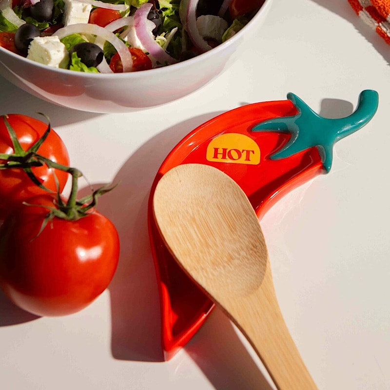 A ceramic spoon rest, designed in the shape of a hot chili, embodies the lively essence of a farmer's market with its vibrant and provocative allure.