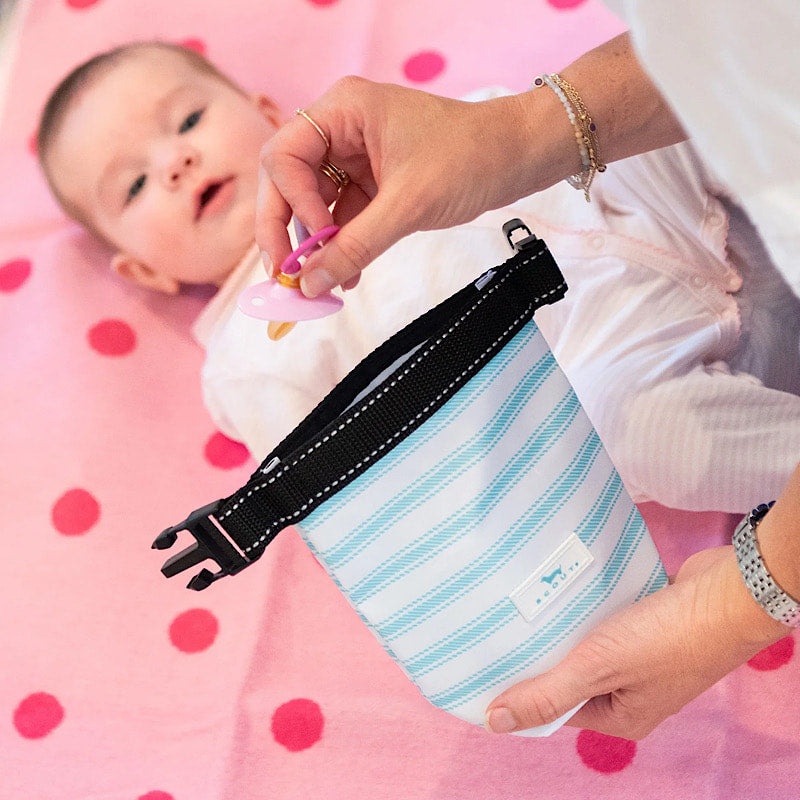 KEEP PACIS CLEAN + CLOSE FOR QUIET MOMENTS. If anything needs safekeeping when you've got a baby in tow, it's the life-saving pacifier. This food-safe, wipe-clean paci case will keep yours clean, safe, and within reach at all times for quiet moments when needed. Also makes a great snack bag! The top folds closed and features a buckle to easily attach to stroller or diaper bag.