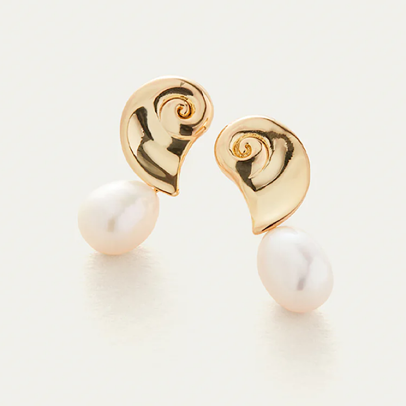 A pair of small earrings with lightweight movement to dip your toes into the nautilus trend. A cool freshwater pearl is suspended from a small nautilus. Finished in high-polish gold.