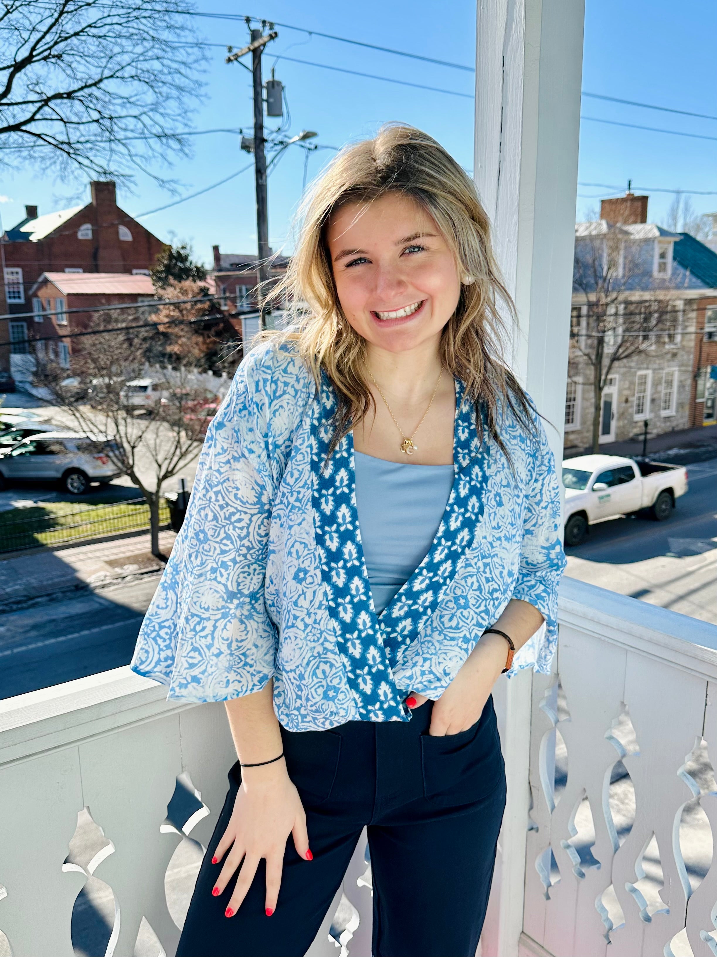 Blue Printed Overlap Blouse