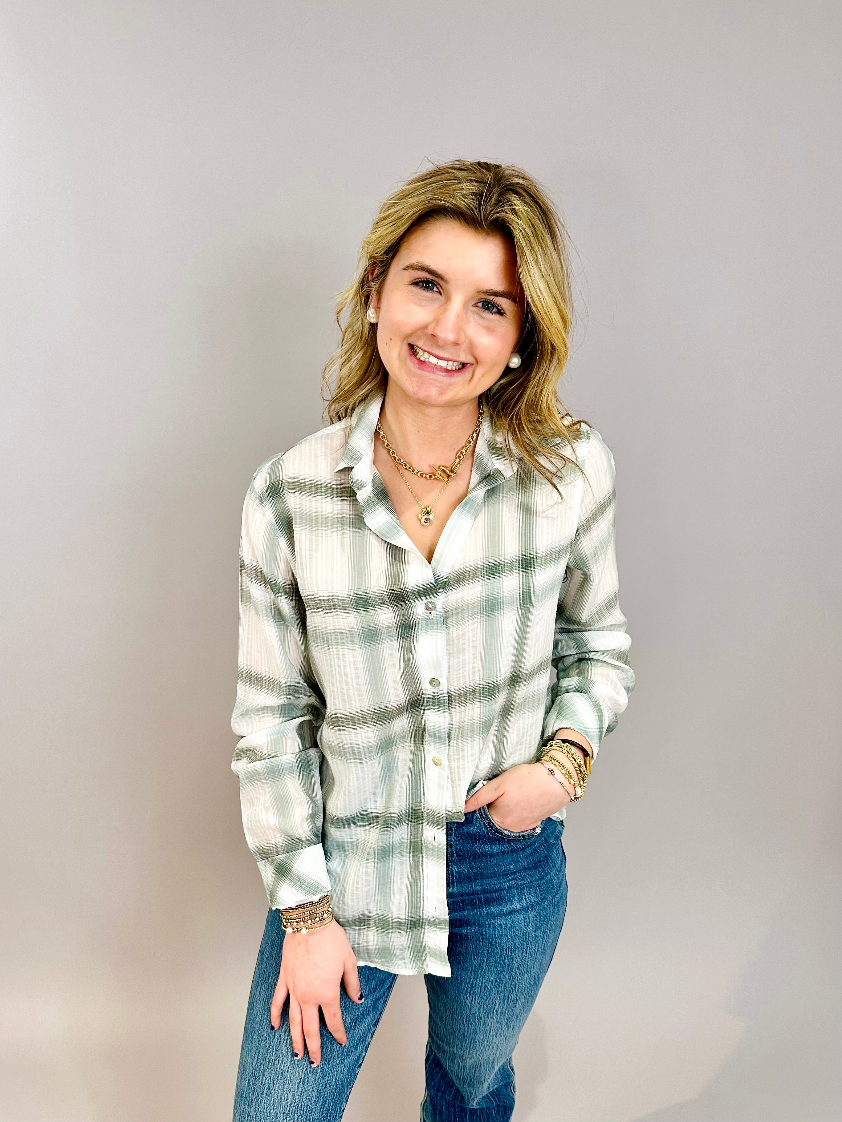 Sage Shadow Plaid Button Down