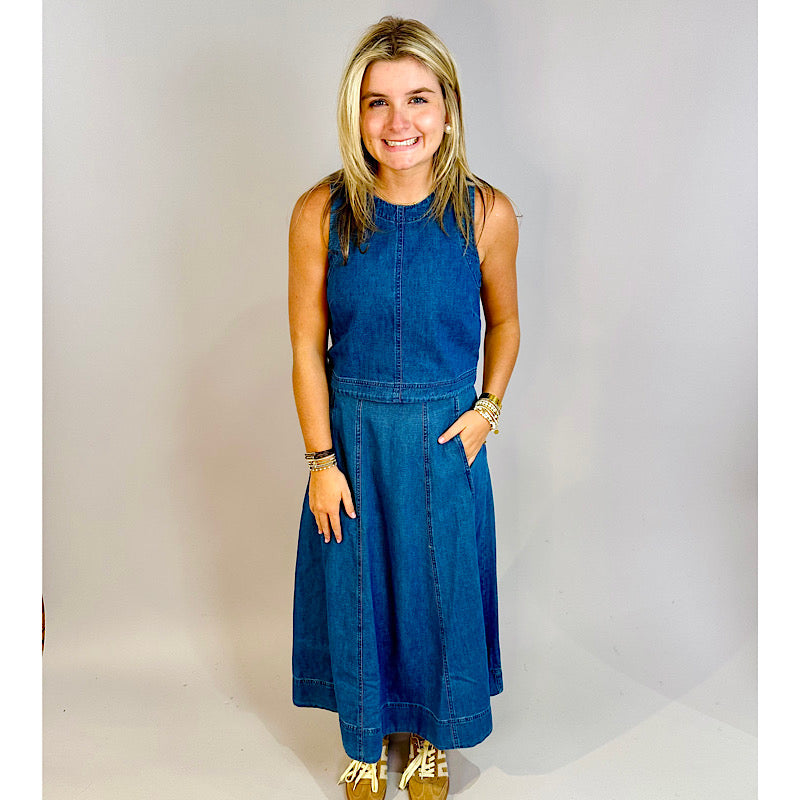 First, we have to talk about these seams: beautiful denim detail that goes all around the body. They also hide the side zip entry and a pair of hand pockets, which honestly the world just needs more of. Pairs great with our Charlie Longline Vest for a full denim look, or throw on your favorite sweater for something a little more cute and casual.