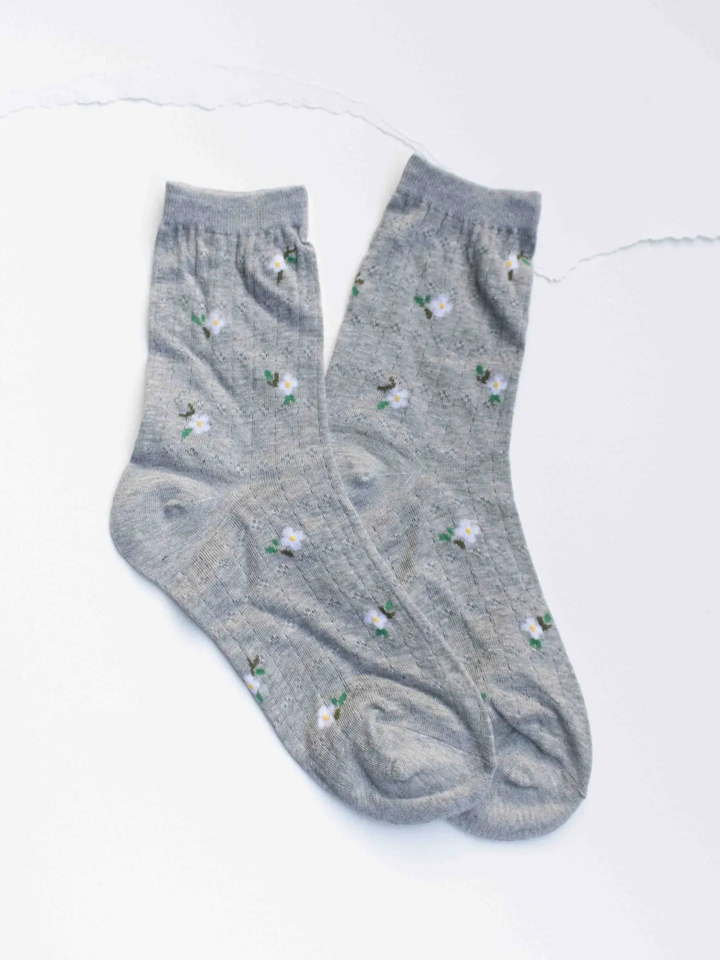 Designed with tiny scattered blossoms and a soft ribbed texture, they bring a timeless, feminine touch while remaining comfortable for daily wear. The breathable cotton blend and gently scalloped cuff provide a soft stretch and secure fit without feeling tight. Perfect for pairing with sneakers, loafers, or boots, these socks add a playful yet classic detail to any wardrobe. Details Mini floral pattern Soft ribbed knit texture Scalloped stretch cuff Comfortable everyday crew length Lightweight and breathable Cotton blend One size fits most (Women)