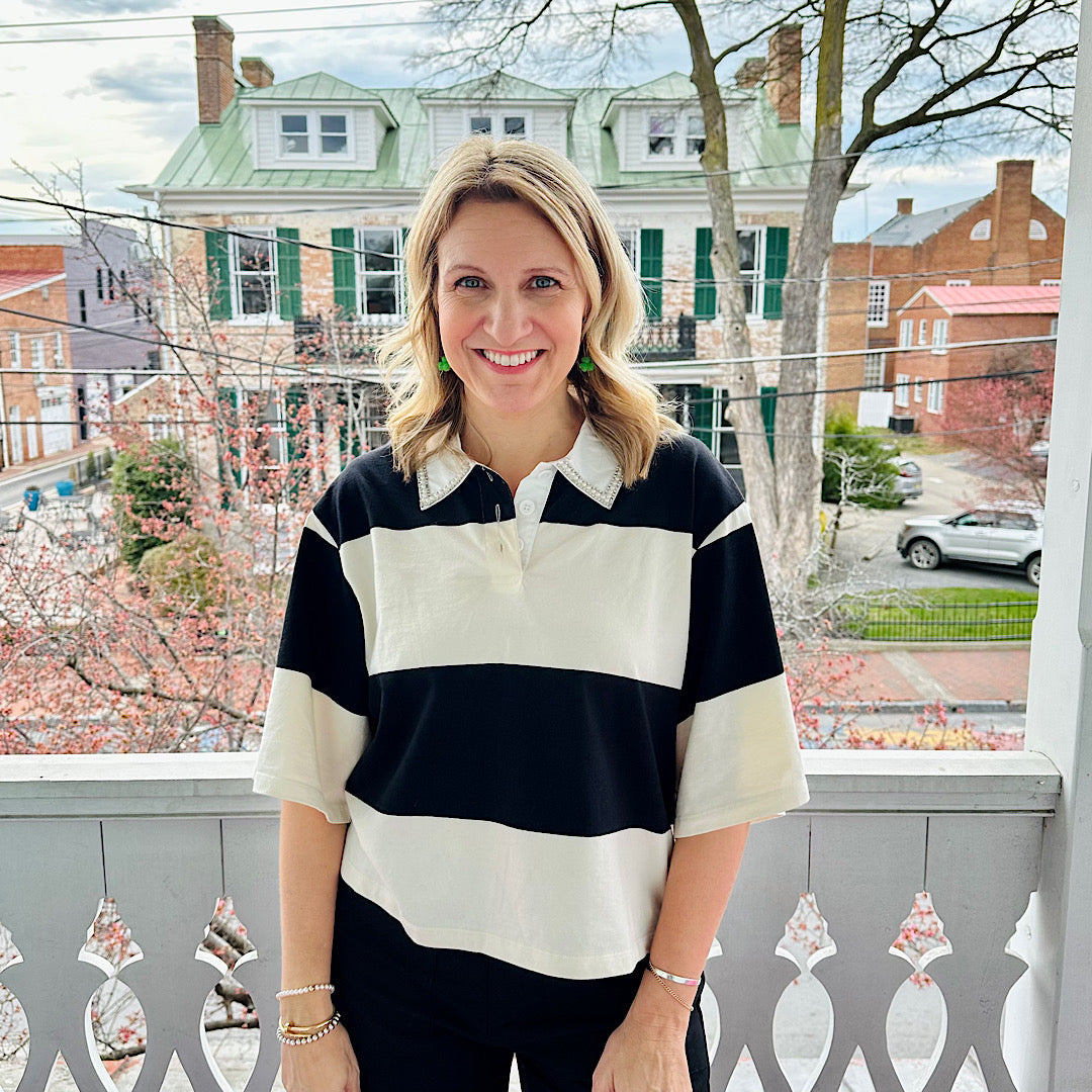 Embellished Polo Tee Black Striped