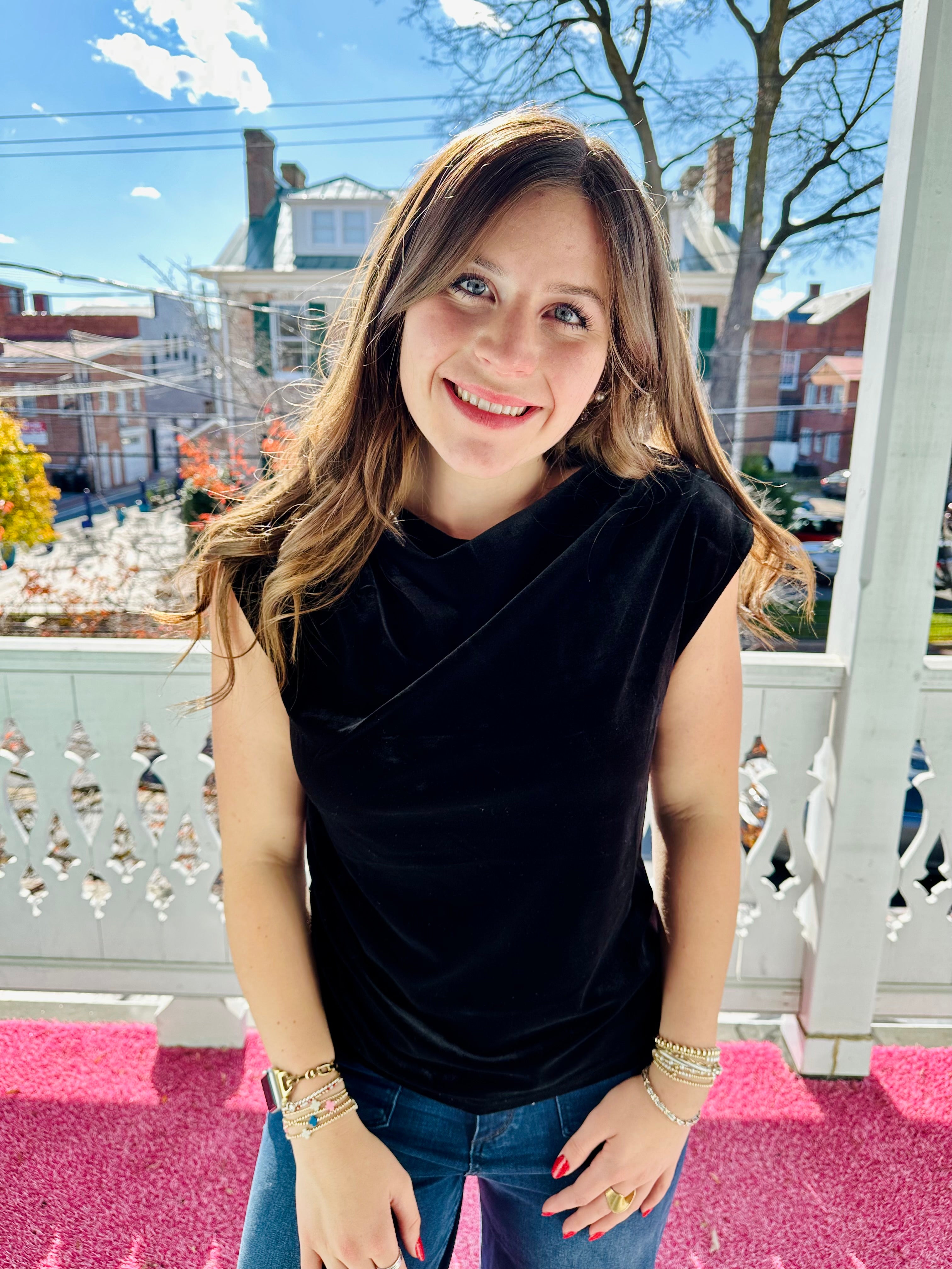 Pleated Sleeveless Velvet Top Black
