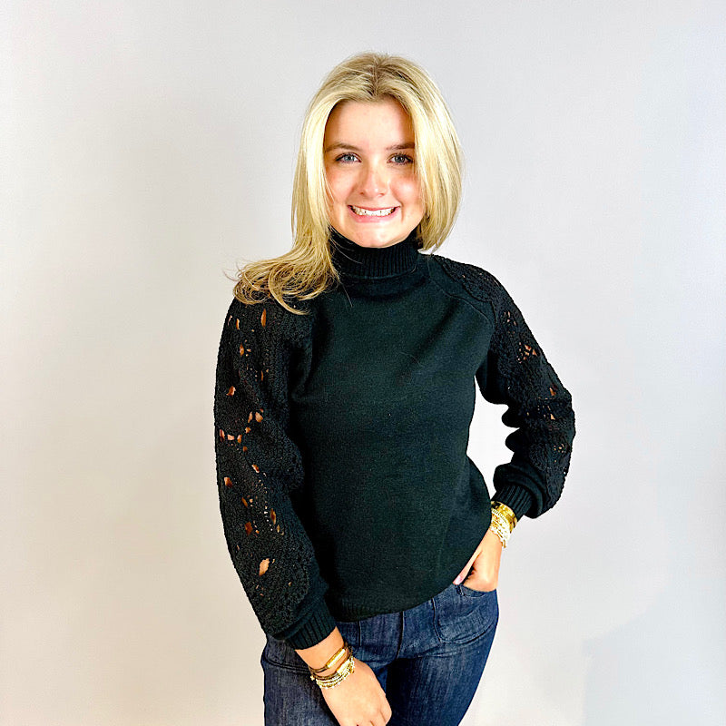 Black Crochet Sleeve Mock Neck Sweater