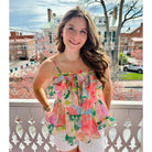 Rayon-blend floral camisole blouse with ruffle detailing and full lining.
