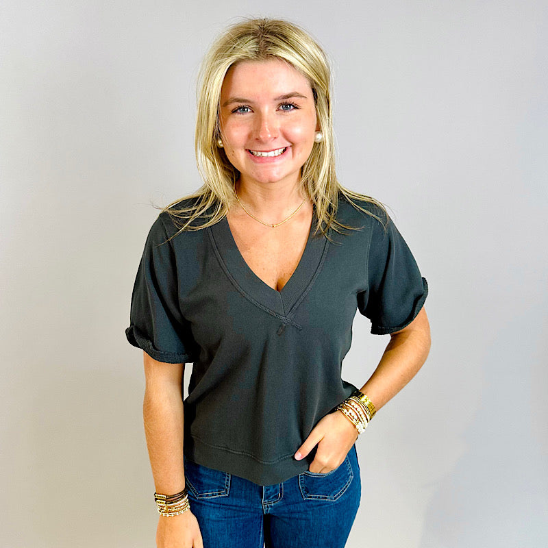 meet the briggs sweatshirt, a fresh spin on a fan favorite. made from soft french terry with a deep v-neck and short sleeves featuring a built-in rolled cuff (yes, it stays put). slightly boxy, banded at the waist, and ready to sub in for your usual tee.