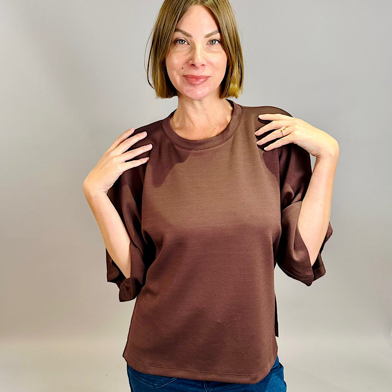 Solid elbow sleeve top featuring wide relaxed silhouette. Unlined. Knit. Non-sheer. Lightweight.