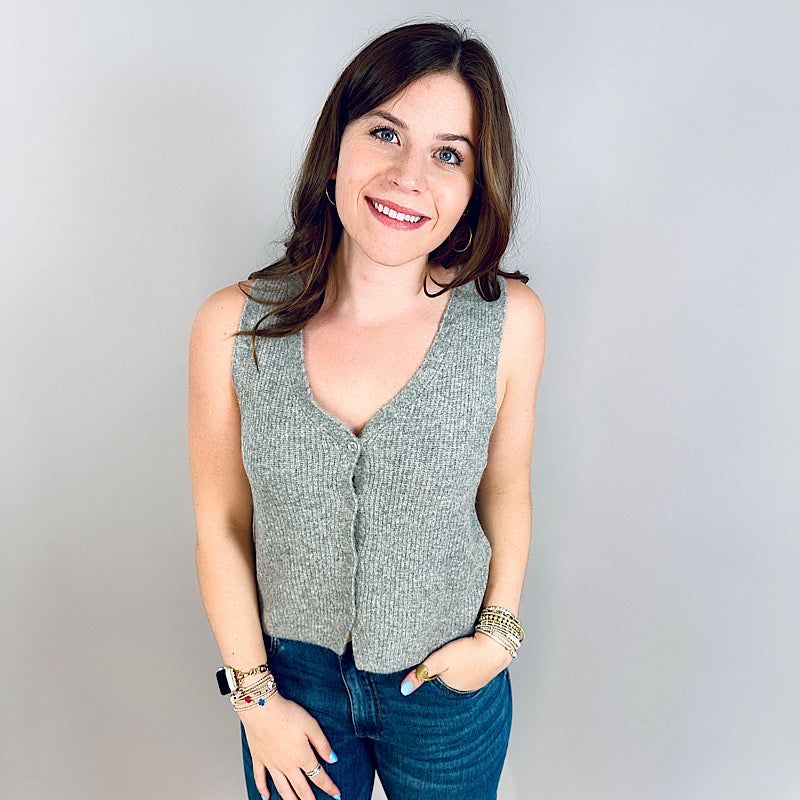 Designed in our soft Cozy Summer yarns, this sleeveless v-neck brings an airy weight and textured rib detailing. A standout piece that works solo in warm weather or layered as temps cool.