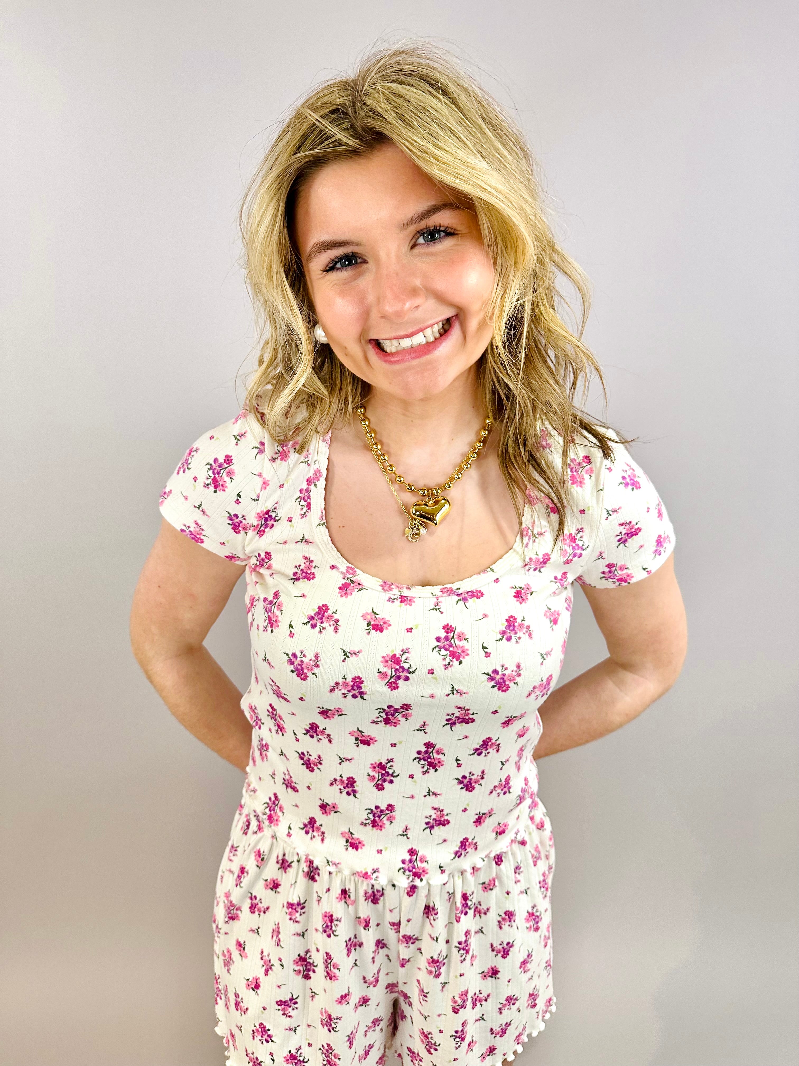 Made from silky pointelle fabric, this fitted cropped tee brings a fresh feel with its floral ditsy print and scoop neck. Lightweight and breathable, it’s an elevated loungewear essential.