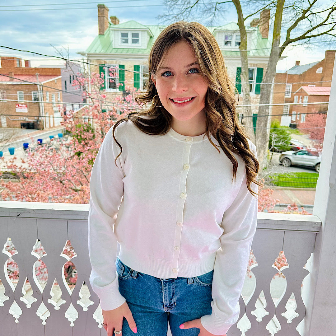 JENNIFER LONG SLEEVE CREW NECK CARDIGAN - WHITE