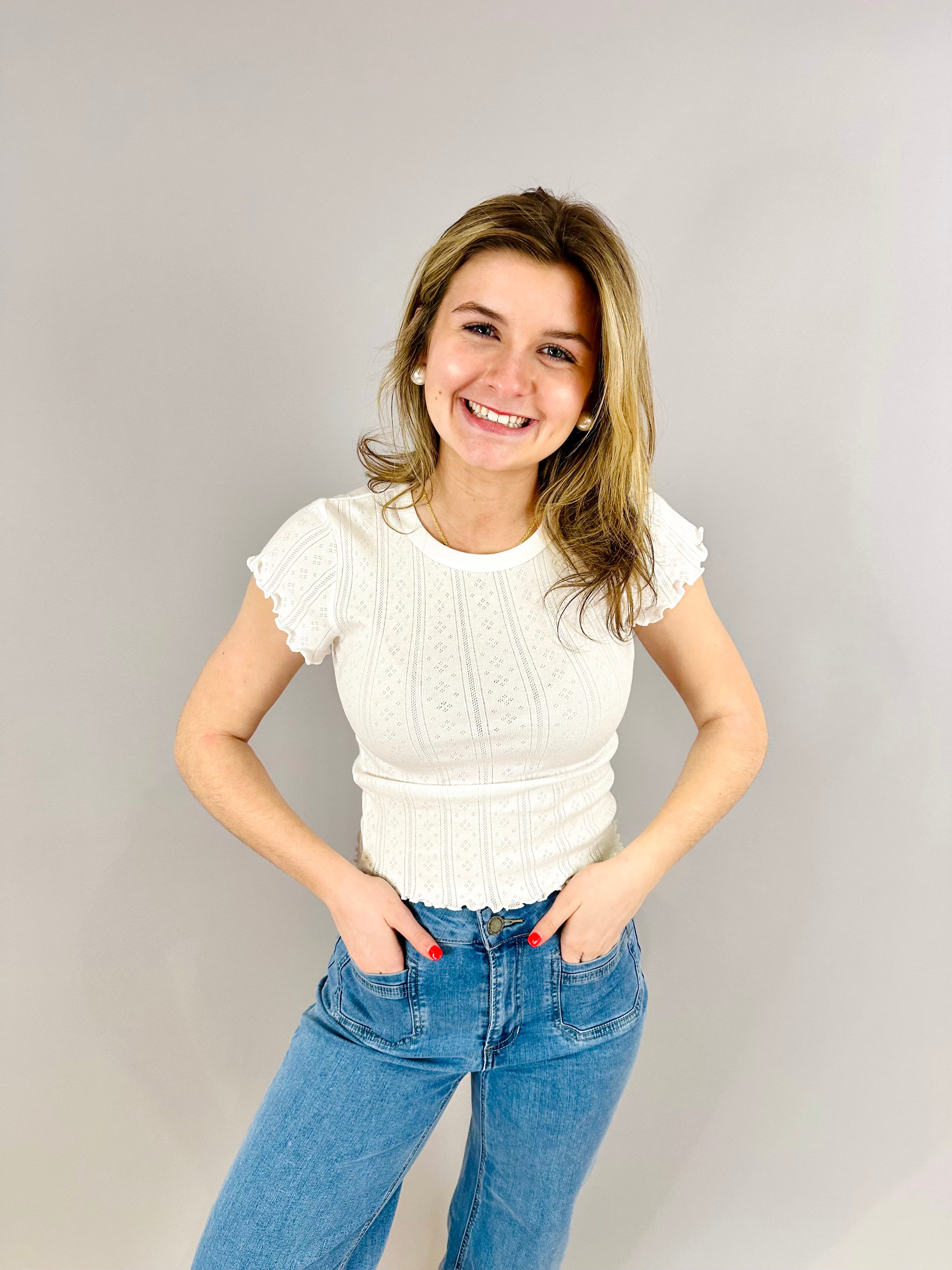 The Lily Baby Tee is constructed from an intricate pointelle fabric and features vintage-inspired lettuce hems. Add a softness to any outfit, or pair with the Soho in Rosewater for a monochromatic look.