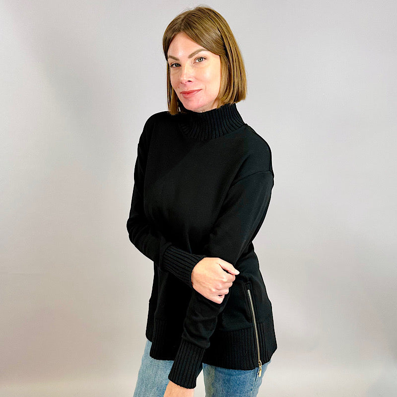 Designed in sleek midweight knit, this mock neck has a relaxed fit you’ll always reach for. Ribbed trim adds subtle texture, while side zips let you adjust the profile; loose and laid-back or tucked and styled.