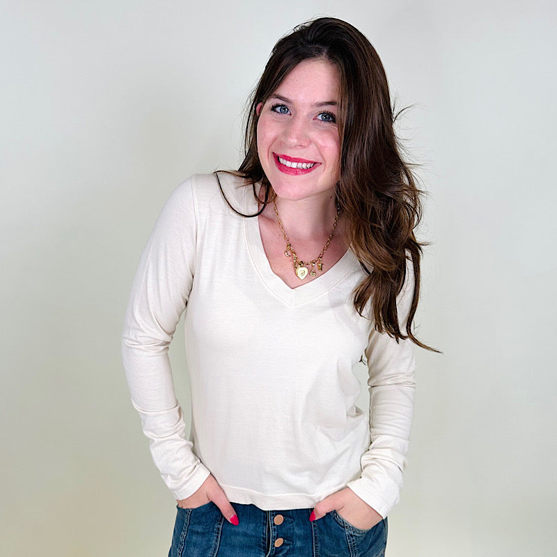 if you love our bestselling frankie tee, meet her long sleeve counterpart: the sinatra. crafted from soft, breathable supima cotton, this v-neck tee is designed for year-round wear. with full-length sleeves, a mid-waist hem, and a classic v neckline, it’s an easy essential that fits true to size.