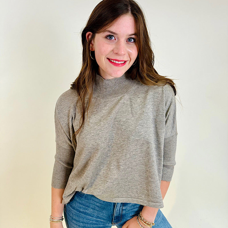 Boxy mock neck 3/4 sleeve top in solid color with rib hem accents