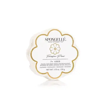 Everything you love about Spongellé® in a convenient travel-size Spongette meets Daisy Collection’s signature flower design infused with more washes. Accepted on all airlines, leak-proof, easy to carry, and everything you need for soft and radiant skin. Enjoy our assortment of eight travel-friendly blends in Bulgarian Rose, Coconut Verbena, French Lavender, Freesia Pear, and Grapefruit Cassis to spruce up any vacation or trip to the gym. Good for 7+ washes per buffer.