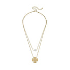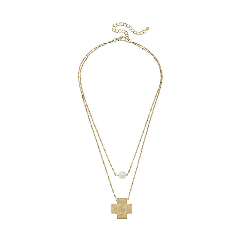 Canvas: Edith Square Cross Layered Pearl Necklace in Worn Gold