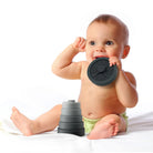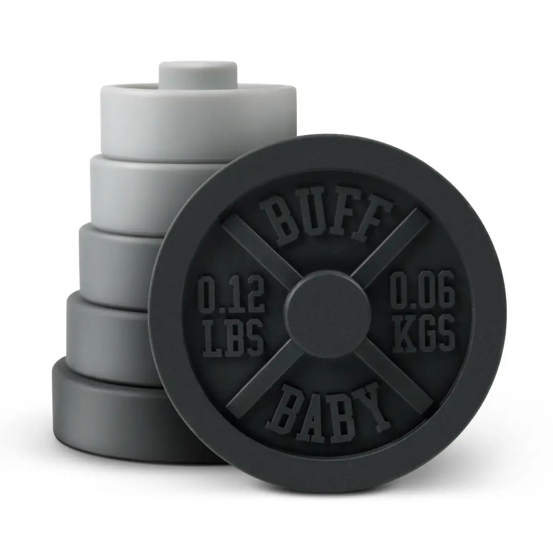 Gym-inspired baby stacker and teethertoy • Includes 6 soft silicone “weight plates” • Baby-safe, BPA-free, and teething-friendly • Builds coordination and soothes gums • Gift-ready packaging • Measuring approx 5" tall assembled