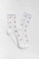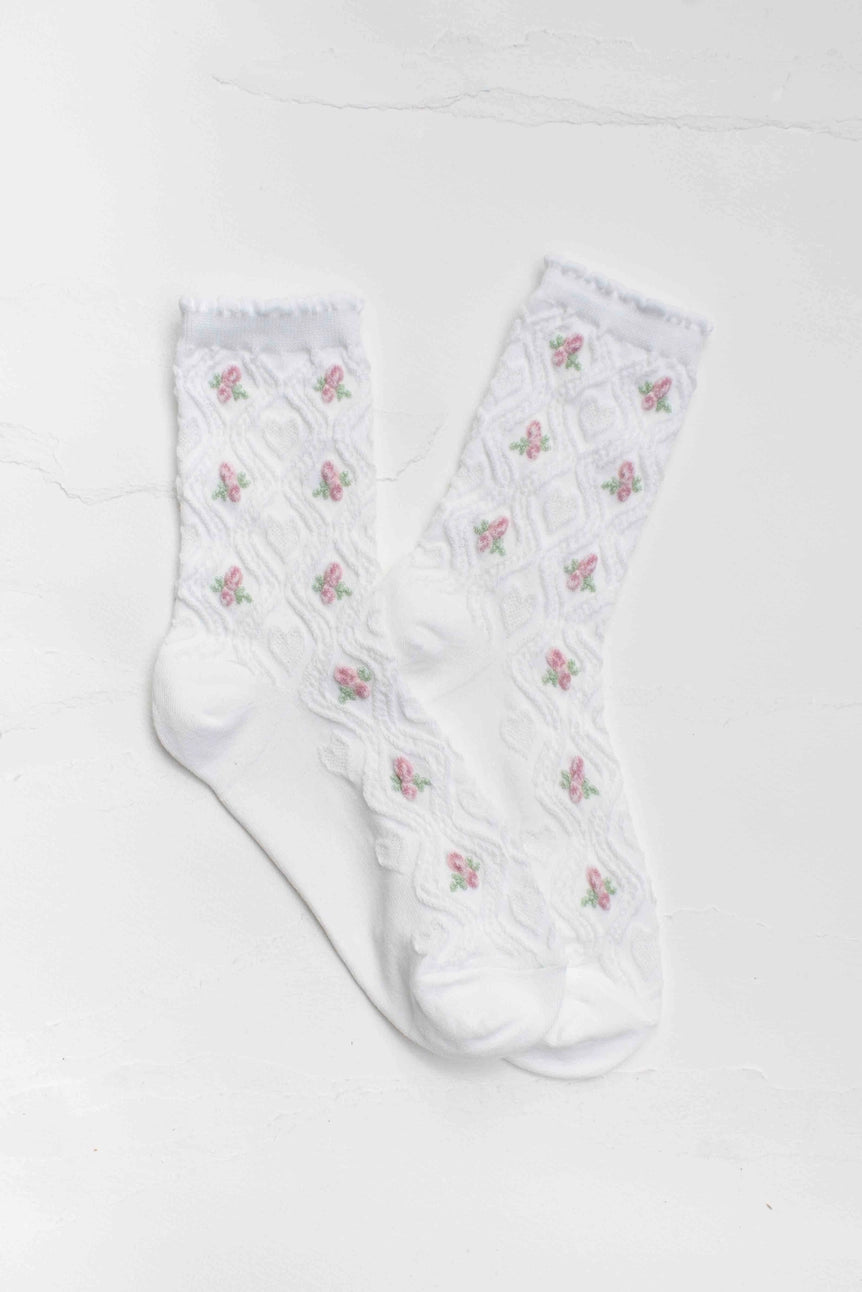 Add a delicate vintage touch to everyday outfits with these charming floral crew socks. Featuring a textured cable-knit pattern and tiny embroidered floral motifs, these socks blend classic design with a soft feminine feel. The subtle raised knit creates beautiful dimension while keeping the socks comfortable and breathable for daily wear.
