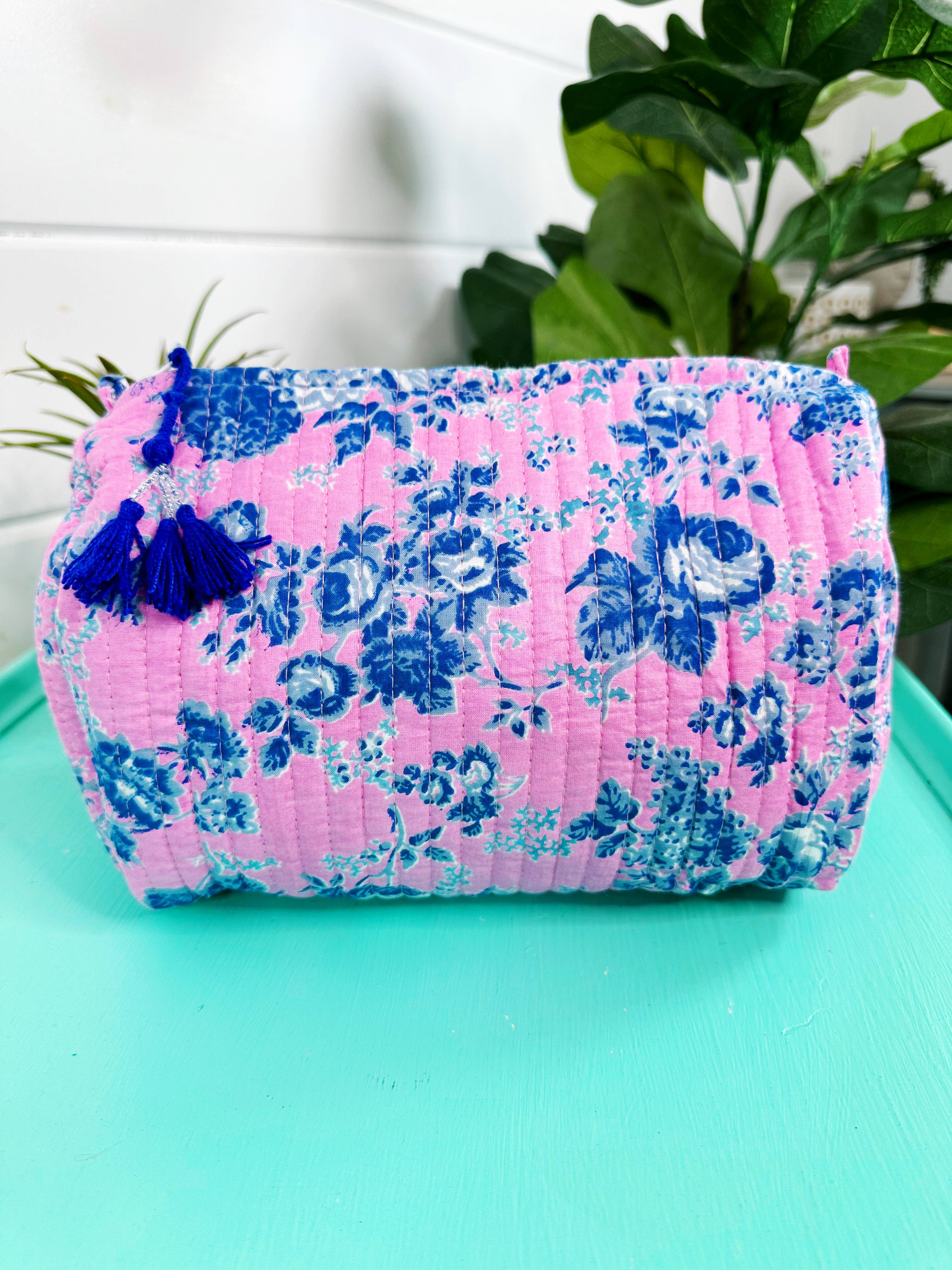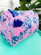 Discover our Handmade Pink and Blue Cottage Floral Print Quilted Travel Cosmetics Bag, perfect for organizing beauty essentials and toiletries on the go. Featuring a wipeable vinyl interior with interior side pockets and a stylish tassel pull tie zipper, this bag combines functionality with unique design - Approximate dimensions: 10" x 8" x 6"