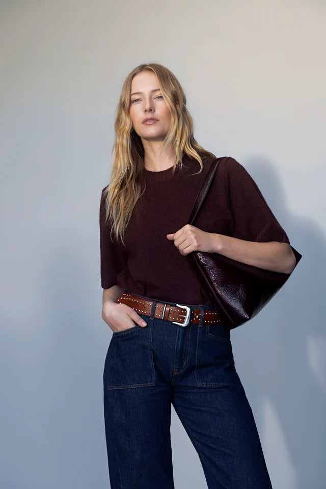 The Rowan Studded Belt Mahogany by Sanctuary Clothing features silver studs in different sizes and a shiny silver buckle.