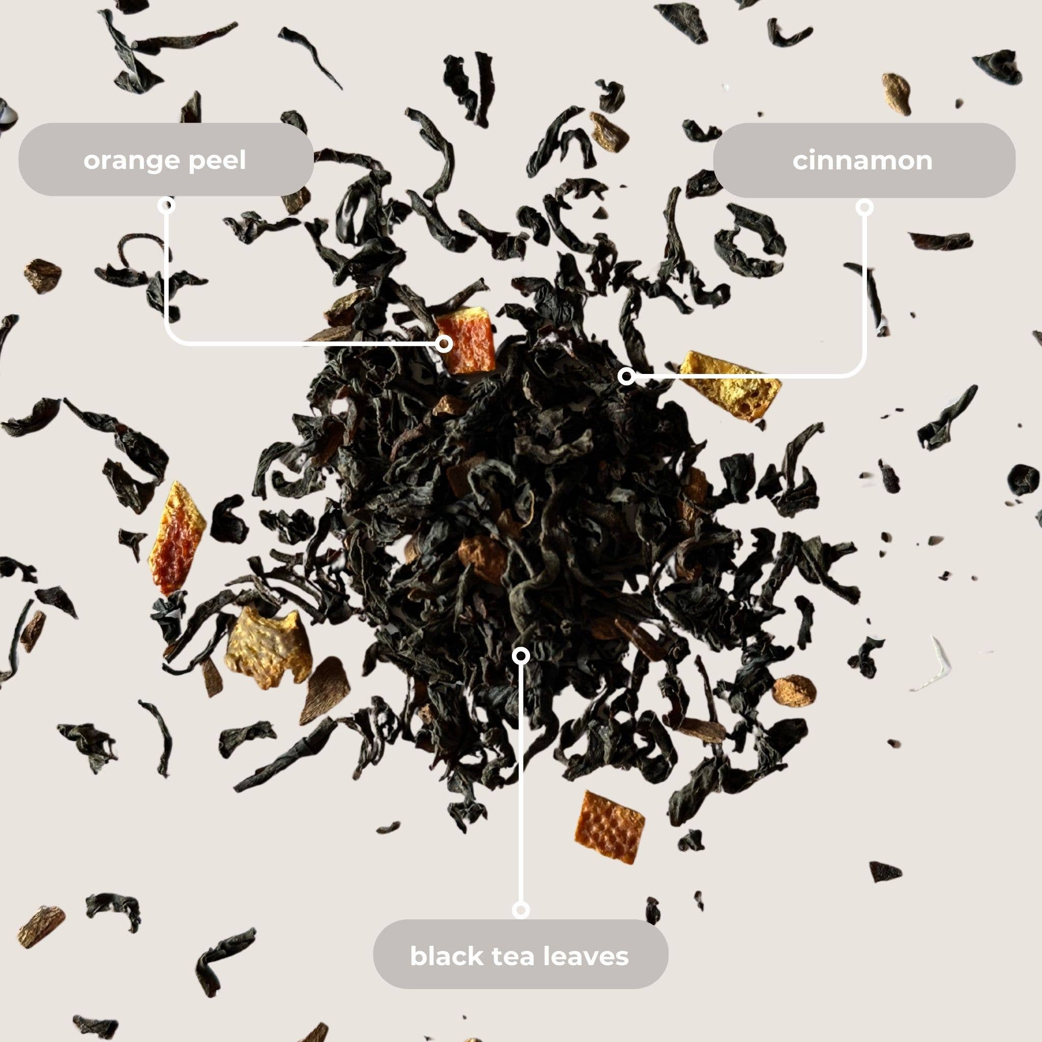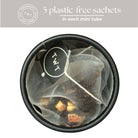 Each mini tea tube is 2” wide and 3.5” tall and is made from 100% recyclable rigid paper tube material. Inside are 5 pyramid tea bags that are made from premium, plastic-free, biodegradable material. Each tea bag holds approximately 2-2.5 grams of whole-leaf tea and herbs. Most customers get at least 2-3 steepings out of each bag. RUDOLPH'S DELIGHT: Our take on a hot cinnamon spice blend made with lots of black tea, cinnamon, and orange peel. This is the tea that keeps Rudolph guiding Santa's sleigh around the world all through the night!