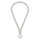 Add a touch of elegance to your outfit with the Silver Front Toggle Necklace from Susan Shaw. This beautifully crafted piece features a unique toggle closure and a pendant measuring 1.25" in width and 1.5" in length. The 18" chain length is perfect for showcasing the necklace's exquisite details. Susan Shaw's jewelry is handmade by skilled artisans, ensuring a level of quality and sophistication that stands out. This necklace, like all Susan Shaw designs, reflects the brand's commitment to using the finest materials and delivering exceptional customer service. Perfect for any occasion, this necklace is a must-have addition to your jewelry collection.