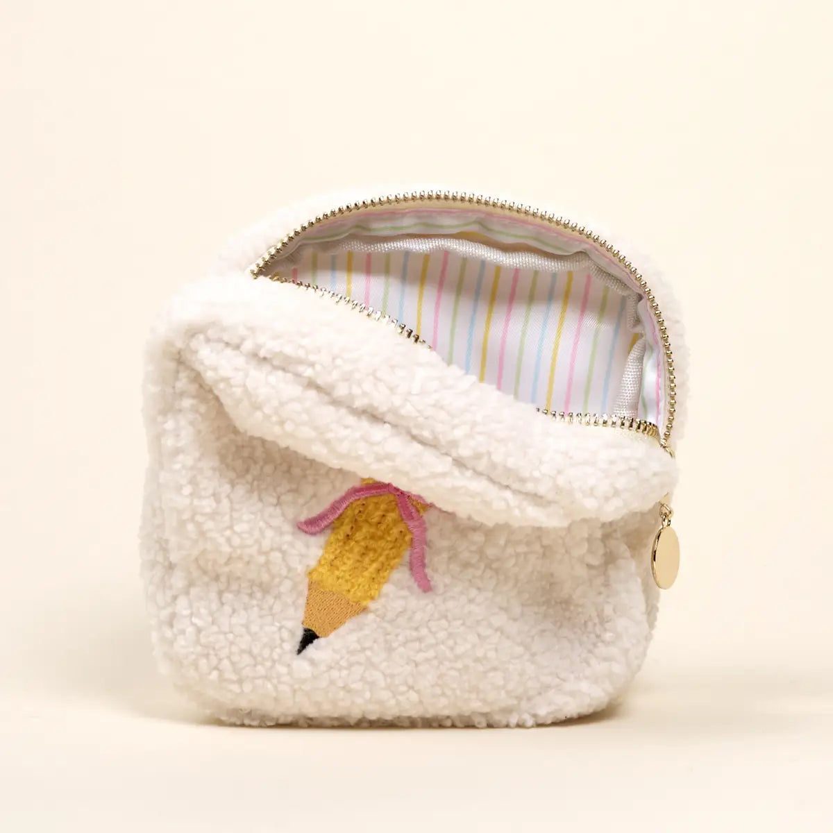 Bring a cozy, stylish touch to your everyday essentials with our teddy pouches. Made from soft sherpa fabric and finished with a wipeable interior lining, they blend charm with practicality for on-the-go organization. The polished gold zipper and printed inner fabric make the pouch just as delightful on the inside as it is on the outside. Mix and match with coordinating sizes for a darling, cohesive accessory set that works beautifully year-round.